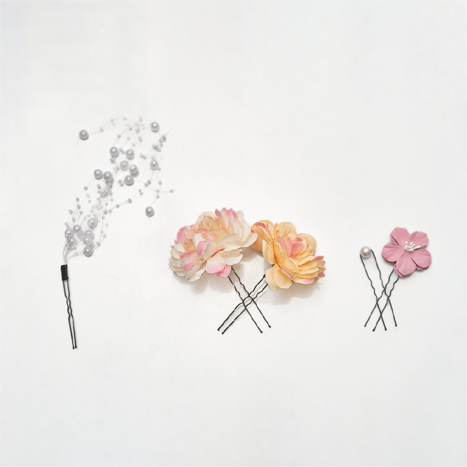 花大:2本(色違い)、花小:1本、パール紐:1本、パール粒ピン:1本 の、計5本セットです。