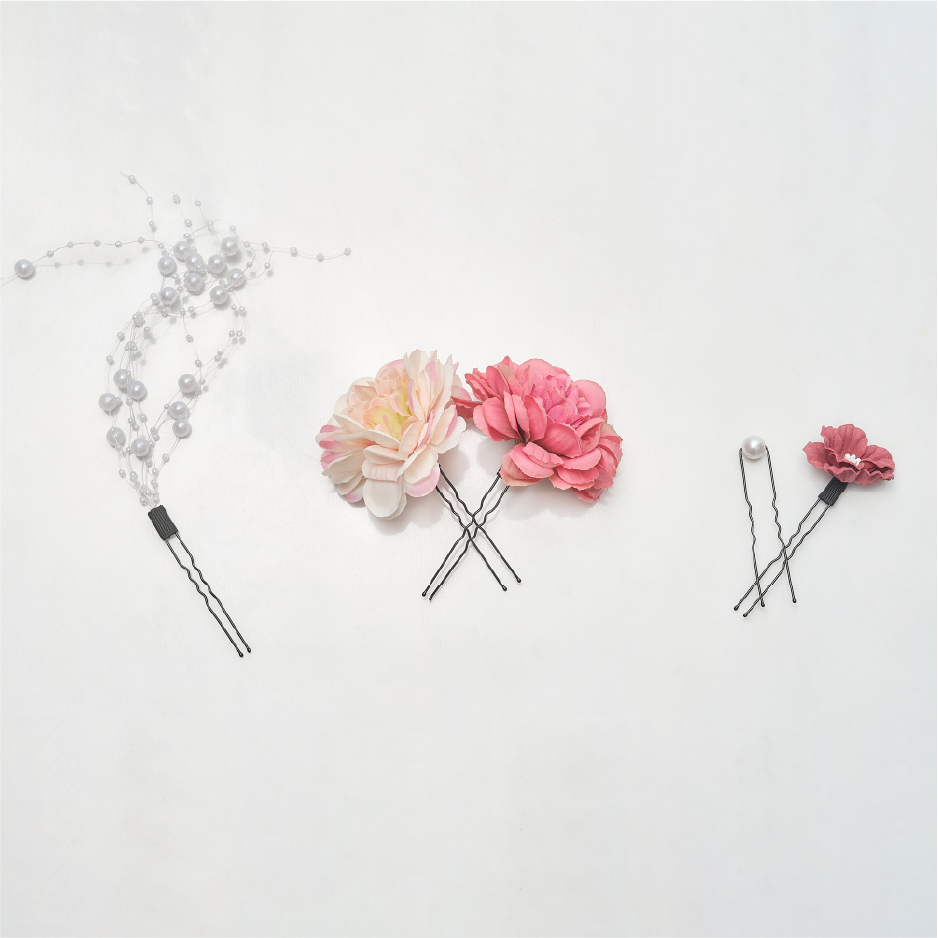 花大:2本(色違い)、花小:1本、パール紐:1本、パール粒ピン:1本 の、計5本セットです。